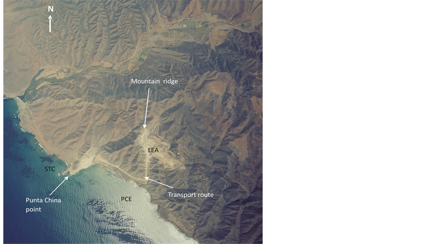 Figure 4. Aerial image of Punta China point, showing PCE to the South and STC to the North, and the mountain ridge that confines the limestone bed to the South. Also shown is the transport road from the extraction area to the deposit and barge-loading sites. Source: aerial image by INEGI, 2006.