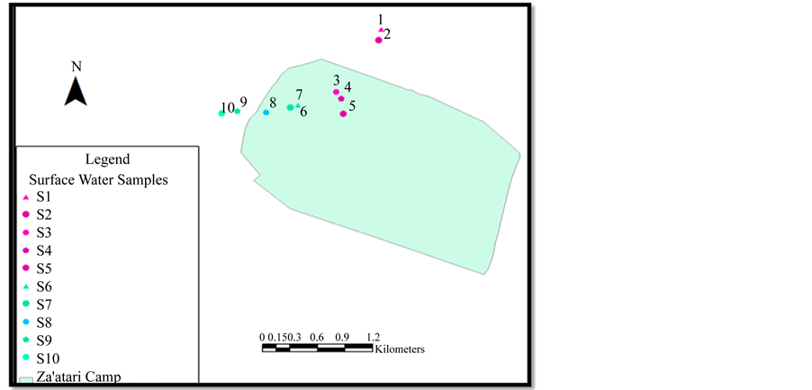Surface water samples were collected during the rainfall season 2013-2014. Sampling campaign was done after each rain fall events from ten sites within and surrounding the camp area. Two samples were at the northern edge of the vamp, six sites were within the camp area and two sites from the effluent water discharging from the camp area. Location map of these sites are shown in Figure 2. The selected sites were restricted to the western part of the camp due to security reasons, where researchers were not allowed to cover the entire camp.