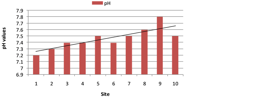 Table 1 shows the average chemical composition of the collected water sample from different sites within the study area. The acidity of the water samples as illustrated in Figure 3 showed an increase in alkalinity with the flow of water inside the camp. This can be attributed to the buffering effect of carbonates rocks of the area and not due to the anthropogenic activities of the camp. The total dissolved solids showed a wide variation between the sampling sites as it ranged from 231 ppm from sites before the surface runoff enters the camp to 1200 ppm in sites within the camp decreasing to 400 ppm for the water discharging from the camp area (Figure 4). The variations can be attributed to no anthropogenic activities at the influent site before the surface runoff enters the camp area increasing with its flow inside the camp as the highest concentrations were at the end of the camping area then diluting with mixing of the rainfall with the effluent out of the camp area. Within the camp area there was a variation in salinity which can be attributed to variation in number of inhabitants and the human activities diversity at different places in the camp.
