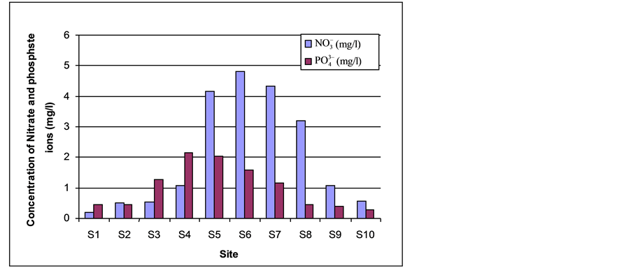 For nitrates and phosphate the highest concentrations were found inside the camp area (Figure 5) which are due to daily anthropogenic activates of the people living inside the camp. However, the highest concentration was detected at the mouth of the effluent water discharging from the camp and the lowest at area outside of the camp area where no anthropogenic activities exists.