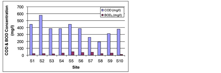 Table 3 and Figure 7 show that there is pollution in the surface water. COD concentration was high at the beginning of the camp in sites (S1-S2) due to the use of chemical organic substances which are not analyzed by bacteria, the values of COD in surface water in the study area ranged between 256 mg/l in site (S7) to 276 mg/l in site (S2). COD values were vary between the study sites because of different human activities and accumulation of wastes that contain different organic materials and the running of rain water which is laden with pesticides coming from farms that surround the camp. With regard to BOD, it was observed that there was an increase inside the camp in site (S5), as the concentration of BOD5 was 50 mg/l because of the inhabitants’ intensity and their organic remnants. BOD was high inside the camp in site (S6-S7) because of the presence of swam- py water that is mixed with sewage, and water used for washing pots that is rich with the chemical materials. COD is high outside the camp in site (S9) because of the running of rain water which mixed swampy water, Figure 7 and Table 3 show the concentration of BOD5.