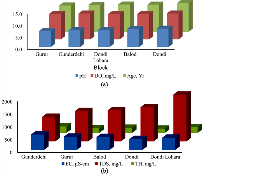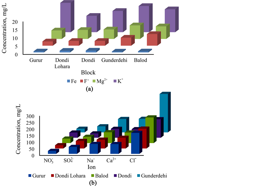 The spatial variation in physiochemical parameters of the water is shown in Figure 2 and Figure 3. The water was found to be acidic in the Gurur block. The remarkably high content of F−, Cl−, Na+, Mg2+ and Ca2+ was marked in the water of Gunderdehi block. However, the water of two blocks i.e. Dondi and Dondi Lohara becomes reddish when exposed to the air due to hydrolysis of the Fe(III) into oxides and hydroxides.