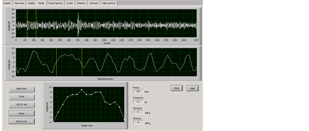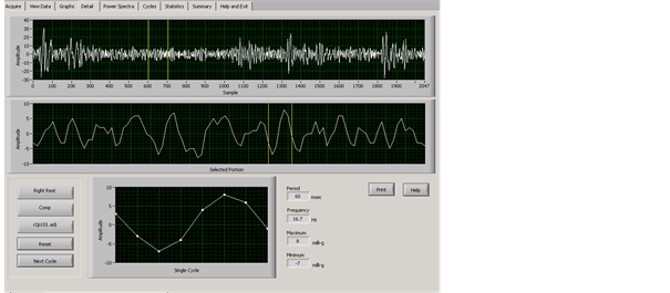An in-depth analysis of the sinusoidal waveforms was conducted. The TremorLab provided graphs of the 20 second tremor samples by three axes, as a composite recording, and these could be broken into one second blocks and single cycles, as well as frequency and power spectra displays. From the visual data display, with exposed group data only, there was an apparent break or stall in the waveforms. Figure 2 and Figure 3 show tremor samples from the dominant