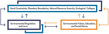 As a final point here, public policy and law also play powerful normalizing and legitimizing roles in society. They are typically most successful not only as top-down mandates, but in their roles as part of, and often responding to, larger social dynamics that include culture and public opinion. In a less linear way, then, but often as a key response to political necessity, or sometimes themselves drivers and nudging influences, laws play an influential social and cultural role beyond their immediate deterrents and incentives. Given the serious and increasingly binding nature of our ecological hard constraints, we observe these basic relationships operating (in all directions at once), driving forward, and demanding responses for more sustainable development (Figure 6).