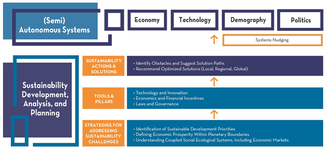 It’s difficult to imagine a wholesale restructuring of economics, markets, or market actors2 when preferences and markets also self-organize with or without government organization or approvals [5] . It’s true that people and culture can be changed (or nudged) through education and the normalizing effects of law. For example, we can support the creation of a culture of more conservation mindedness by taxing the profligate use of natural and scarce resources. Markets will also engage automatically when we are (eventually, but certainly not ideally) driven by ecological necessity, crisis, or collapse. Here again there may be more immediate sustainability opportunities, ideally going all the way back to research and planning activities, and guided by models like the three pillars to achieve improvements, positive feedback effects, and the nudging of markets and other semi-autonomous systems (Figure 4).