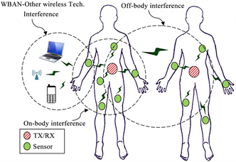 Unlike the WSN where the sensor nodes are distributed in a wide area, WBAN consist of a small number of sensor nodes (most often about six) that are placed in or around the human body for remote monitoring. Figure 1 shows some of the different wireless sensor nodes in or around the body. Several sensors are placed in clothes, directly on the body or under the skin of a person and measure the temperature, blood pressure, heart rate, ECG, EEG, respiration rate etc. Since the sensor monitoring includes lifesaving human body signs which may determine between life and death for the patient, high reliability is expected in both the sensing and data transmission [3] . Unfortunately, performance of these WBANs decreases in high interference scenario’s such as densely populated areas and in the ISM wireless band as this frequency band has co-channel interference from other technologies using the same frequency, such as IEEE 802.15.1 (Bluetooth), IEEE 802.11 (wireless fidelity - Wi-Fi) and IEEE 802.15.4 (zigbee). As opposed to the previous WSN used for WBAN such as IEEE 802.15.4, the IEEE 802.15.6 addresses these special needs for WBAN and is required to function properly within the transmission range of up to 5 meters when up to 10 WBANs are co-located [4] . Thus, there is as well high possibility of interference amongst WBANs operating in close range and other technologies as well. This is because of the mobility of the human body and the activity of the different body parts such as legs, head, arms among others which causes intra and inter-WBAN interference. Figure 2 shows an interference scenario in wireless body area networks.