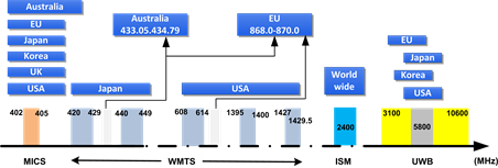 The WBAN operates different frequency bands in different countries [16] . A summary of some of the frequency bands available for WBAN in different countries are shown in Figure 3. Medical Implant Communications Service (MICS) band is a licensed band used for implant communication and has the same frequency range (402 - 405 MHz) in most of the countries. Wireless Medical Telemetry Services (WMTS) is a licensed band used for medical telemetry system. Both of the MICS and WMTS bandwidths do not support high data rate applications. The Industrial, Scientific and Medical (ISM) band in 2.4 Ghz frequency range supports high data rate applications and is also available worldwide. However, the chances of interference are very high as many wireless devices including IEEE 802.1 and IEEE802.15.4 operate at the same ISM band.