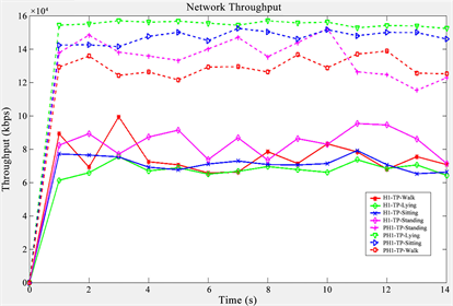 We define the throughput as the sum of the number of successful messages delivered per a unit time at a node. Figure 5 shows the performance of the existing IEEE 802.15.6 WBAN model (H1) and the proposed WBAN interference mitigation model (PH1) against time for the network throughput. The dotted lines indicating the proposed model confirms an improvement in bandwidth efficiency of the proposed by a significant level in mobility scenarios. The lying posture shows the most performing posture model which can be attributed to the minimal mobility nature of the posture which basically experiences nodal mobility only with group mobility being constant. The results show increased network throughput in the proposed model for a WBAN for all the postural mobility scenarios from average of 80 Kbps to 150 Kbps.