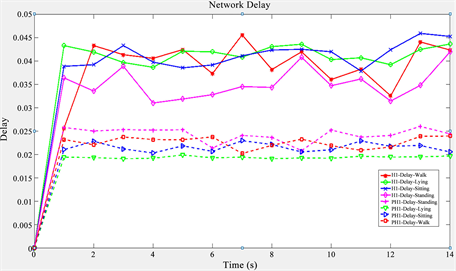 Network delay is an important factor in the performance of WBAN because of the nature of the applicability of the WBAN. In our simulation results, the network delay performance is demonstrated in Figure 6, in which the delay is shown against time for the various postural mobility. The proposed model (dotted) showed improved performance in all mobility scenarios as compared to the existing (continuous line graphs). We see a decrease in network delay in the proposed interference mitigation model (PH1) for all postures compared to the existing IEEE 802.15.6 WBAN (H1). This indicates a magnificent improvement in the WBAN in terms of delay performance. This a clear demonstration of the improvement in the proposed model.