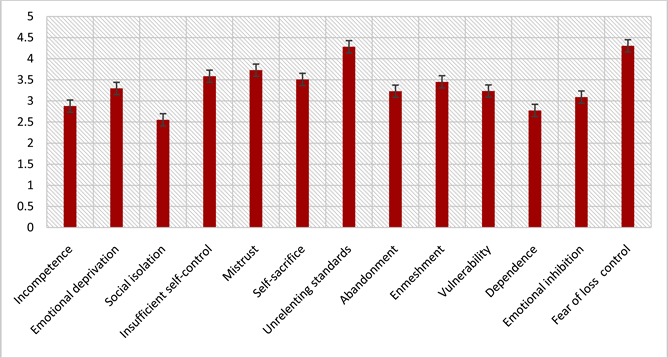 This nomenclature leaves only four schemas with a more distant relationship with anxiety: the emotional deprivation schemas with its dominant cravings; Self-sacrifice associated with guilt; while Fear of loss control and insufficient self-control often characterized by the absence of anxiety. This guide to say, that anxiety is often an indicator of non-specific malaise that requires further evaluation. In our result the schema including anxiety in its definition: Vulnerability is active but ranked seventh after (Fear of loss control, Unrelenting standards, insufficient self-control, Self-sacrifice, Enmeshment, Emotional deprivation) depending on the degree of activation in the students (Figure 2).