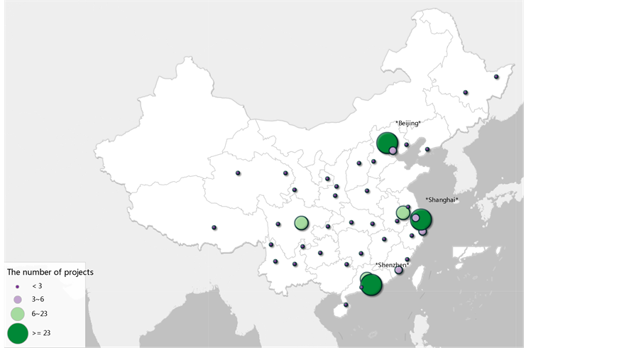 Their distribution in Chinese mainland is shown in Figure 2 and Figure 3. 261 projects distributed widely in mainland, covering 43 cities. The northernmost one was in Jiamusi of Heilongjiang; the westernmost one was in Lhasa of Tibet; the southernmost one was in Haikou of Hainan. From the perspective of number, most of them
