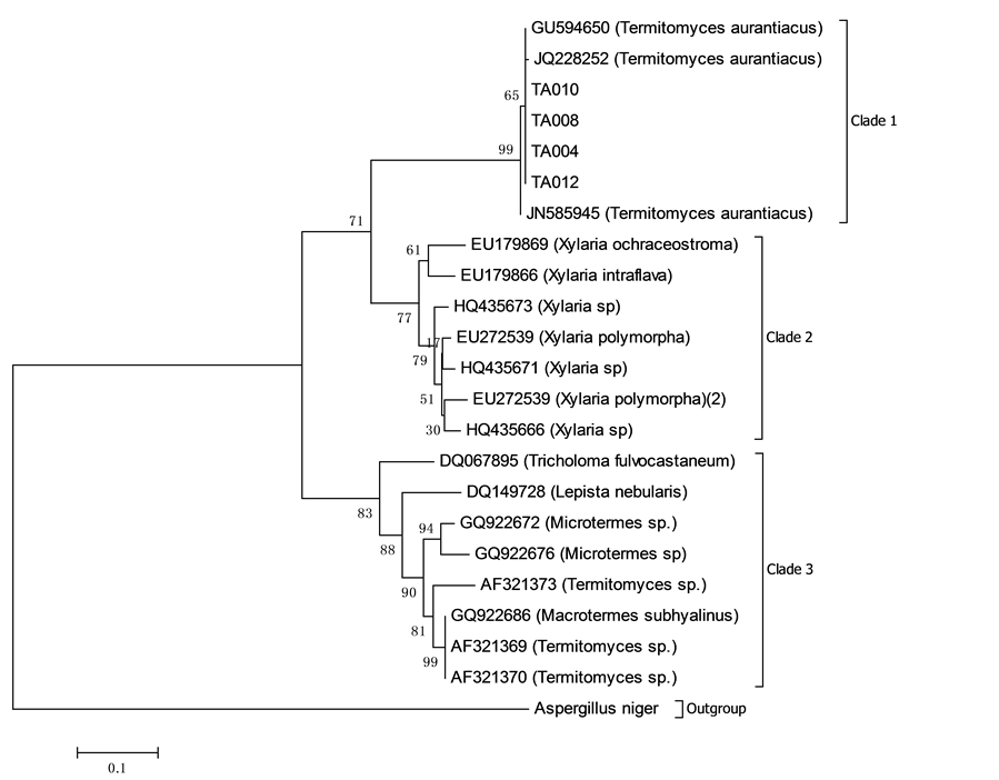 The ITS 1 and 2 regions of the rDNA of isolates (TA004, TA008, TA010 and TA012) were successfully amplified by PCR with expected length of ~500 bp. Homology searching against GenBank revealed that these sequences were 100% similar with those of T. aurantiacus, and that none of the sequenced isolates belonged to the genus Xylaria. A phylogenetic relationship was established through alignment and cladistic analysis of homologous nucleotide sequences among these fungal species (Figure 5); the isolates were found to belong to the genus Termitomyces. According to this phylogenetic analysis, isolates were a species variant of T. aurantiacus.