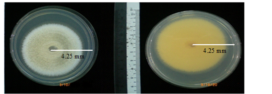 The colony growth rate of T. aurantiacus was 10 - 15 mm per day on PDA at room temperature. The colony was initially watery-white but turned a grayish slightly light white color in the centre of the Petri dish after 4 days of culture. When the colony fully covered the whole plate, it was grayish in color. By days 7 - 8, 50% - 60% of the colony was dark gray and the remaining 40% - 50% was dull gray (Figure 1) looking at the bottom of the dish, the colony was red in color (Figure 1).