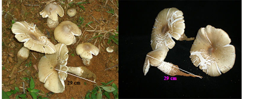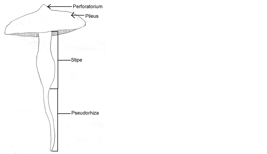 The diameter of the pileus of the isolates was 5 - 8 cm. The pileus were convexo-mucronate with a pointed perforatorium, finally applanate with a recurved margin and the surface was rusty ochraceous to orange, the color was dark brown over the perforatorium, which was finely striated, somewhat scrobiculate towards the centre, and glabrous or with fine, and scattered velar remnants (Figure 2 and Figure 3, respectively). The stipe was a 6 - 8 × 0.7 - 1.0 cm long cylindrical solid with a white or whitish surface, and the annular zone was indistinct or absent. The pseudorhiza was 20 - 25 cm long and white in color.