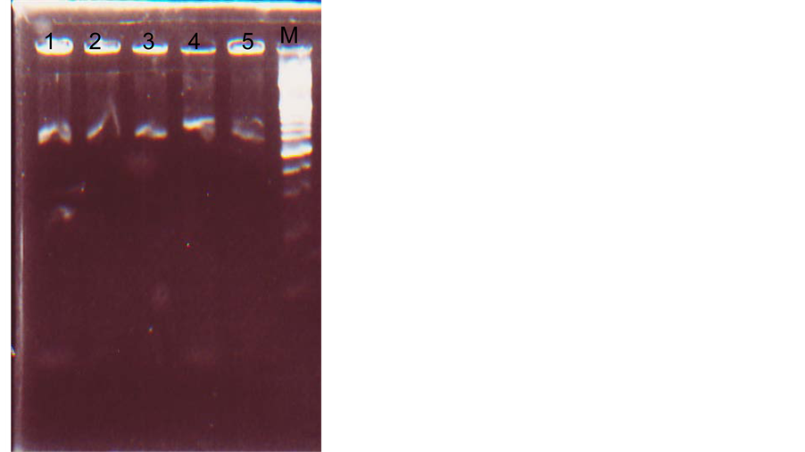 The PCR products were run on a 1.5% agarose gel with a 100 bp (Promega) ladder as the size standard. Electrophoresis was performed in 1 × TBE running buffer (0.045 M Tris-borate and 1 mM EDTA, pH 8.2) at 70 V for 1 - 2 h. The gels were then stained with ethidium bromide (0.5 μl/ml). After 15 - 30 min the gels were visualized under UV light and photographed using an Alphamager® 2200 version 5.5 gel documentation systems.