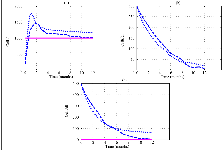 Figure 5. Variation of the concentration of uninfected hepatocytes (a), infected hepatocytes (b) and free virions (c) for a patient. The curves in dotted line represent the parameter for the direct approach. The curve dashed line show the parameter for the direct approach. The curve dashed line show the parameter for the approach integrating the fuzzy logic approachThe curve dashed line show the parameter for the approach integrating the fuzzy logic.