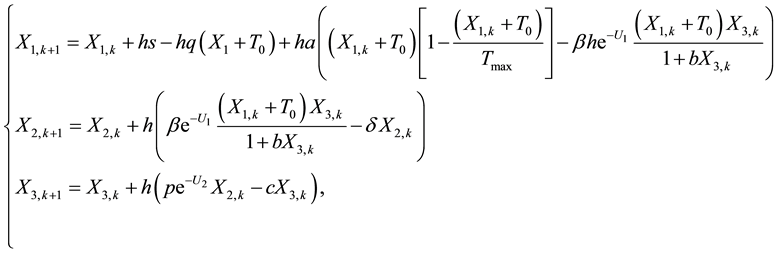 The discretization of the constraints (1)-(3) is done using the first order explicit Euler method. The first order of explicit Euler’s method gives following system