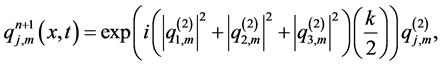 Many numerical methods for solving the coupled nonlinear Schrödinger equation are derived in the last two decades. Finite difference and finite element methods are used to solve this system by Ismail [5] - [10] . A conservative compact finite difference schemes are given in [11] [12] . In [3] [4] , Xing Lü studied the bright soliton collisions with shape change by intensity for the coupled Sasa-Satsuma system in the optical fiber communications. A higher order exponential time differencing scheme for system of coupled nonlinear Schrödinger equation is given in [13] . A semi-explicit multi-sypm- lectic splitting scheme for 3-coupled nonlinear Schrödinger equation is given in [14] . Many researchers are used time splitting method for solving the coupled non-linear schrödinger equation, the basic idea in this method is to split the original system into a linear subsystem and nonlinear subsystem, The splitting simplify the problem, since the linear problem is uncoupling, relatively easy to solve and the nonlinear problem can be solved exactly due to their point-wise conservation law, for more details see [15] - [23] .