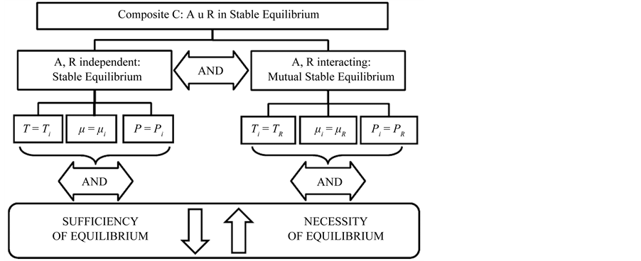 With an opposite logical procedure, Gaggioli adopts the Lowest-Energy Principle to prove that individual- and-interacting stable equilibrium implies temperature-potential-pressure equality [11] . Therefore stable equilibrium is a sufficient condition for equality, hence, once again, “equilibrium => equality”. However, since sufficiency of equilibrium (or necessity of equality) is the sole condition established and proved and, on the other hand, the necessity of stable equilibrium is not proved, then the system-reservoir composite may experience equality of the temperatures, potentials and pressures while the composite itself is not in a stable (or neutral) equilibrium state since the equilibrium is not necessary as well (or equality is not sufficient as well) in contradiction to the assumed stable equilibrium. To resolve this contradiction, reference can be made to the thermal, chemical, mechanical contributions of exergy, which is an additive property, so that the sum of these contributions constitutes generalized exergy as the base for deriving generalized entropy, which is an additive property as well, as demonstrated in Section 5 above. The only procedure to prove the necessity and sufficiency, without disproving the proofs already provided in the literature, is consequently to demonstrate that equalities (or equilibrium) are necessary and sufficient conditions, thus Gaggioli’s statement is also necessary and Gyftopoulos and Beretta’s statement is also sufficient, both implying that the inference equality => equilibrium is complementary to the inference equilibrium => equality so that both equilibrium and equality are necessary and sufficient conditions for each other. In different terms, equilibrium is true if and only if equality is true and equality is true if and only if equilibrium is true. Figure 1 represents the hierarchical structure of the statement of necessity and sufficiency conditions.