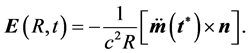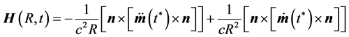 The magnetic field has two components. The first component is exactly equal to the electric field value but turned in space on p/2. The second component depends from first derivative of the time-varying magnetic moment and much less them the first one (in l/R times):