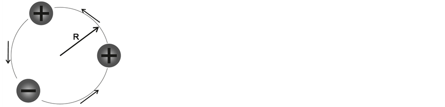 Let our goal to construct a model of proton from quarks with integer charges so that to predict its mass and magnetic moment. We assume that, as in Gell-Mann’s model, proton consists of three quarks. But in our case two of them have charge +e and one −e. Let these quarks do not possess their own spin, and their quantum motion expressed in their rotation around a common center on the circle of radius R (Figure 2).