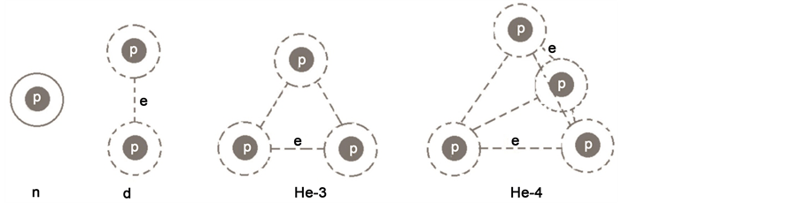 Figure 4. The schematic representation of the structure of light nuclei. Dotted lines schematically indicate the possibility of a relativistic electron hopping between protons.