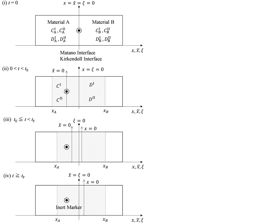 The heat conduction equation proposed by Fourier in 1822 has been applied to investigating the temperature distribution in materials [1] . In 1855, Fick directly applied the heat conduction equation to diffusion phenomena [2] . As far as the shape of heat conduction material is unchangeable during a thermal treatment, the coordinate system of heat conduction equation set in a material is a fixed one, since the coordinate system is not influenced by the variation of internal structure in the material. Here, we should notice that the concentration of diffusion particles is a real quantity in physics, although the temperature is a thermodynamic state quantity. It is thus considered that the coordinate system of diffusion equation set in the diffusion field (solvent) is generally a moving one, since the origin of coordinate system is influenced by a variation of the diffusion field. It is thus indispensable for understanding the diffusion problems to discuss their coordinate systems, since the diffusion particles, solvent particles and also the diffusion region space which means vacancies and interstices among atoms move simultaneously against a fixed point outside the diffusion system.