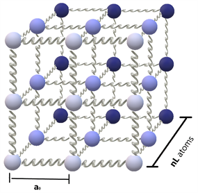 Figure 1 shows the proposed nanocrystal model. It is a simple cubic structure with a lattice constant of a0. There are a total of NA atoms, which means that the side of the nanocrystal has atoms and the total volume is given by . The atoms with mass M are connected to each other through springs characterized by a constant K.