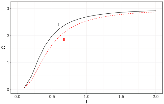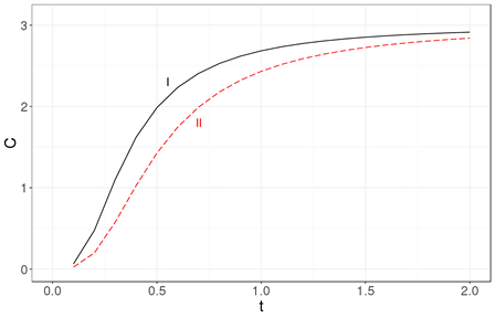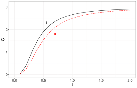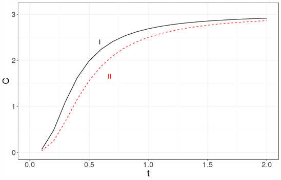 Figure 6. The specific heat of a nanocrystal of 103 atoms evaluated using expression (8) that includes the exact dispersion relation (solid line label as I) and using the linear dispersion relation (dashed line labeled as II). The linearization of the dispersion relation seems to be partially responsible of the discrepancy between the exact value and the Debye approximation for the specific heat.