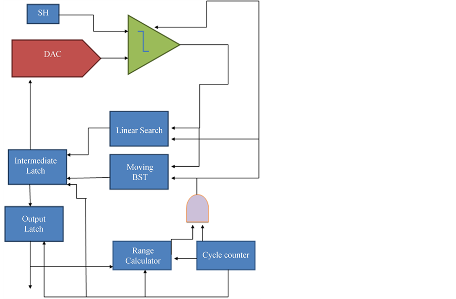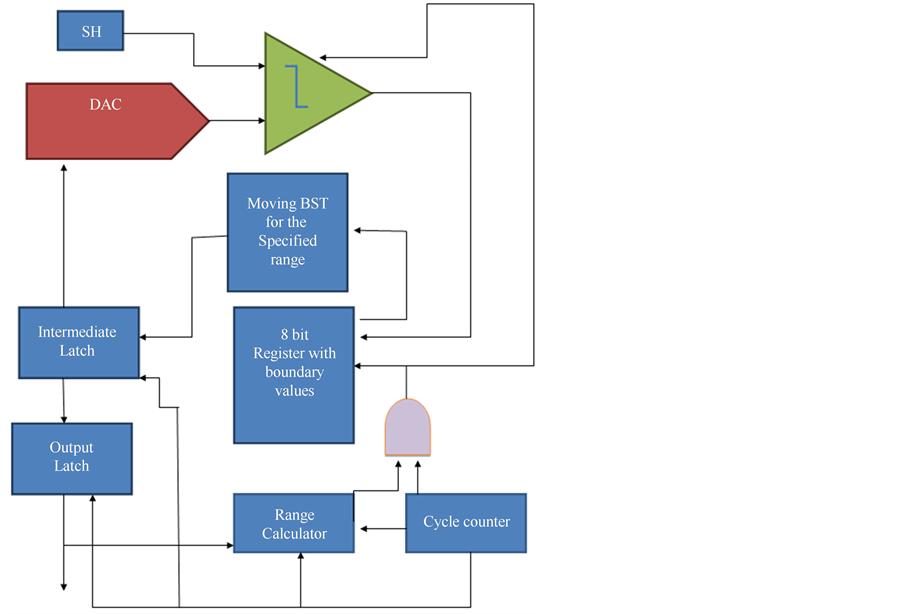 Range calculator consists of a difference-calculating circuit (Figure 6) and a decision-making circuit. The difference-calculating circuit, implemented by full adders, finds the absolute difference between two consecutive signal levels using the complement notation and then passes the result to decision-making circuit. The decision-making circuit decides the size of binary search tree required to cover the changes in signal level for the following conversion. But the moving BST has its own limitations because if the current value is very close to the previous value, then the number of comparisons done to reach the actual target is higher than the difference between the two numbers.