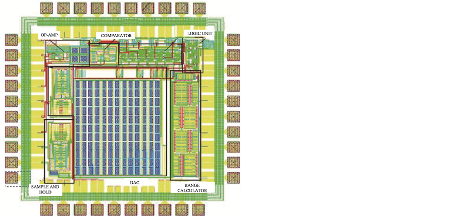 If power consumption was the only concern, then a possible approach of combining all the algorithms would be feasible. Using a range calculator and a difference calculator unit in identifying the type of input signals and the difference in consecutive signals could help in choosing which algorithm to be used. Hence a select signal can be extracted which chooses which algorithm to use for which input signal. The improvement in convergence time is shown in Figure 14. A sample input and its corresponding output for the designed ADC is shown in Figure 15. Figure 16 shows the layout of the proposed ADC. Table 1 shows the comparison of the ADC performance with other state of the art ADCs currently existing. Figure 17 shows the measured output of the ADC chip.