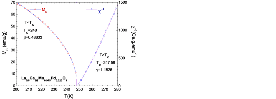 In the range of the ferro-paramagnetic transition temperature, the scaling law was used for the saturate magnetisation and susceptibility and given by [16] [17] . The critical parameters β and γ, are inferred by using