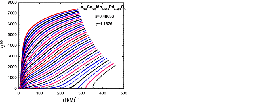 According to the Curie-Weiss law for ferromagnetism, the large magnetic entropy change, ΔSM(T,H), is expected at the Curie temperature TC and has high values for materials having large effective magnetic moment [11] . Since 1996, there have been numerous reports of exceptionally large magnetocaloric effects in perovskite manganese oxides [12] -[16] . In this paper, we report the critical parameters b, g and d determined from the Arrott plots, Arrott plots modified and magnetocaloric effects of the La5/8Ca3/8Mn0.975Pd0.025O3 compound by analyzing the magnetization curves.