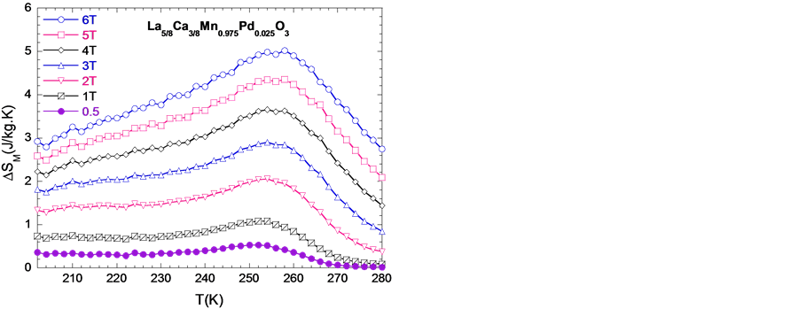 The magnetocaloric phenomena was investigated using the applied field dependence of the magnerisation, M(H), at different temperatures. The result is displayed in the Figure 5. The magnetocaloric curves calculated for the applied fields of 0.5 T up to 6.0 T. As can be seen from Figure 5, the peaks of those curves shift to the higher temperature in higher applied field. In the low field, magnetocaloric shift to the ferro-paramagnetic transition temperature, TC = 247.79 K. This can be understood that the magnetocaloric phenomenon is strongest at