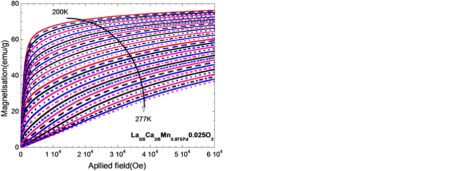 Figure 2. The isotherm curves of the La5/8Ca3/8Mn0.975 Pd0.025O3 sample at different temperatures.
