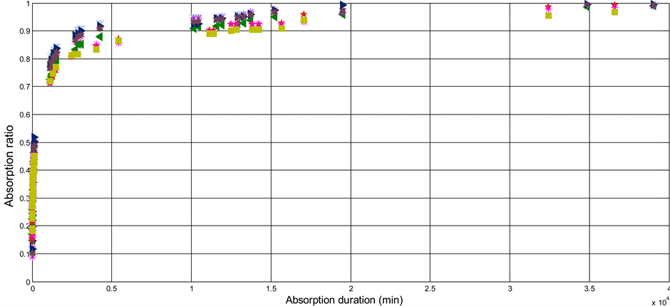To evaluate the kinetics of absorption of these Shells, starting from the experimental data, we calculate the moisture ratio of the instantaneous rate of absorption noted MR from Equation (3). The curve of MR for each species, presents two phases: an initial phase having a very great slope as of the first instance that the CS is in contact with water; and a final stage characterized by a very weak slope which is asymptotic with MR = 1. The