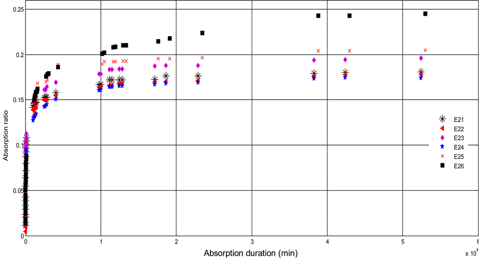 The samples intended for the tests were dried in a standard drying oven of mark memmert model UN 160 to 105˚C for 4 hours. Under the above drying conditions after 4 hours, the mass of the samples of CS do not vary any longer. This was proven experimentally by [5] . After stoving the samples, once cooled, they were putting distilled water in order to follow their kinetics absorption. The experiments undertaken made it possible to determine the rate of water absorption and to model the kinetics of absorption of these shells using the gravimetric method. The experiment was carried with the help of numerical balance of 0.01 g precision. The samples are weighed after stoving before being immerged to determine their initial drying mass m0. For each sample, one notes the moment to which it was immerged, the sample was weighted aftertime duration in water. Making sure that the hygroscopy water was delicately removed and by minimizing the removing time from water. We note m(t) the wet mass of the sample at the instance t. We repeat this experiment until the mass of the sample does not vary anymore and it was notes the equilibrium mass meq.