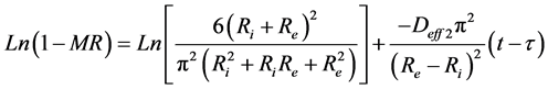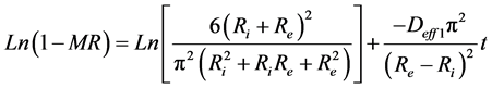 In the case that the interior radius r = Ri and the exterior radius r = Re are maintained with concentrations C1 and C2 respectively such as C1 = C2, the solution of Carslaw and Jaeger is given by the expression of the equation while limiting at the first term of this series we obtain Equation (7) given by;