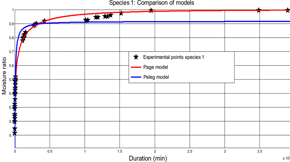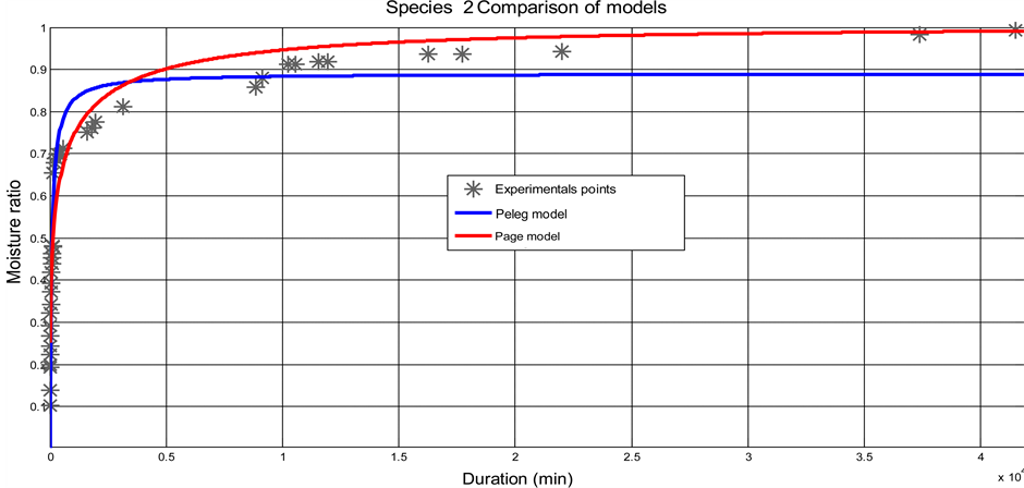 The Page model predicts very well the kinetics absorption of the CS according to the values of the statistical parameters such as: r² and RMSE. Figure 3 shows the adjustment of Page and Peleg models to the experimental data of each species.