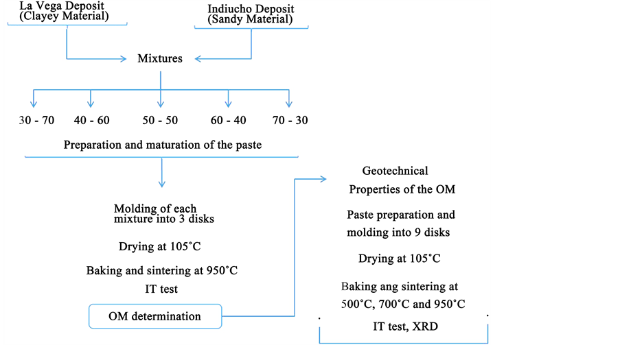 The samples were sieved (sieve #18) to remove the inert components of the material, thereby obtaining grains of less than 1 mm. No specialized treatment, such as those reported by Kornilov and Luzin [17] , was used for the activation of the clays. We characterize the clayey (from LVG deposit) and sandy materials (from IND deposit) by doing granulometric analysis, XRF, differential thermo gravimetric analysis, X-ray diffraction and the geotechnical properties of the 90/10 mixture. The optimization of the mixture and its characterization were performed following the procedure outlined in Figure 1.