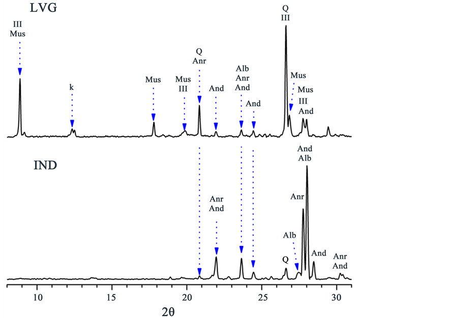 Figure 2. Diffractograms of the LVG and IND samples. Illite (Ill); muscovite-2M (Mus); kaolinite (k); anorthite (Anr), albite (Alb), and andesine (And); and quartz (Q).