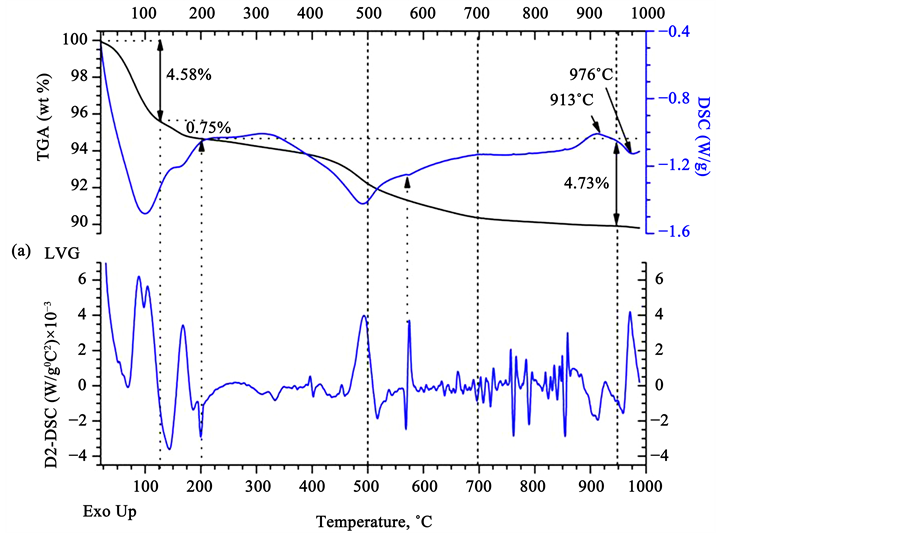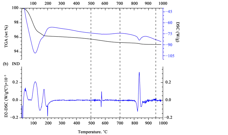 (see the TGA curve in Figure 3(a)). The wet mass exhibited a dimensional change during drying at temperatures in the range of 0 to 150˚C takes because of the loss of water from its pores [20] . Above 120˚C and up to approximately 200˚C, a turning point appears in the DSC thermogram of Figure 3(a), probably related to the removal of hygroscopic water from the illite and other minerals, which caused the sample to lose approximately 0.75% of its weight. In the literature, it has been reported that the effect associated with kaolin in this temperature range is very small compared with that associated with illite [21] . At 200˚C, a sharp endothermic peak is evident, probably due to the thermal desorption of weakly absorbed (physisorbed) water adhered to the particle surfaces through a van der Waals-type attraction. Such water is adsorbed at active sites associated with defects in the structure and is typically observed to be present in amounts directly proportional to the number of particles. In the range from 200˚C to 500˚C, the oxidation of organic matter typically occurs, and the loss of energy due to the loss of organic mass associated with the clay particles is relatively low [21] . In fact, the combustion of organic matter depends on the size of its constituent particles and on their distribution in the sample, which gives rise to small but wide peaks during heating. In the range of 300˚C to 350˚C, a maximum can be observed in the DSC curve in Figure 3(a), probably related to loss of water from the hydrated iron oxide [22] . In fact, a maximum can be observed in the D2-DSC curve in Figure 3(a) in the range of 304˚C - 315˚C, where the thermal energy flow remains constant over a small temperature range before it begins to decrease once again [21] . In the D2-DSC curve of Figure 3(a), between 380˚C and 480˚C, several events can be observed that are not visible in the DSC curve because they overlap with the organic matter decomposition; these events correspond to the dehydroxylation of the clay. Dehydroxylation is a thermally activated reaction and depends on many factors, of which time and temperature are the most important variables. This dehydroxylation is a process in which water molecules form and is removed from the structure of the clayey minerals, following the reaction