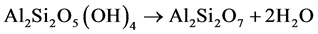 Kaolinite is characterized by a prominent endothermic effect in the range of 450˚C to 570˚C, followed by the destruction of the mineral crystalline network and the formation of metakaolin accompanied by the release of water, following the reaction described in Equation (11) [25] - [27] . The formation of the water molecules generates voids in the crystalline network, and when sufficient voids have formed, the structure deforms, producing metakaolin: