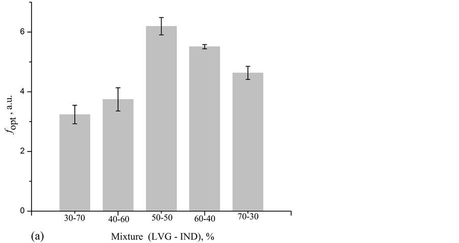 Figure 4(a) shows the values of the optimization factor defined in Equation (10) for each of the tested samples. The mixture with a ratio of 50 - 50 exhibited the highest optimization factor (6.20 MPa/kg) and also the lowest dimensional variations after drying (0.24%) and after baking and sintering (1.52%). Based on these results, we defined the OM as a mixture containing 50% of LVG material and 50% of IND material, or, in other words, with a proportion of 50 - 50. Figure 4(b) shows the diffractograms corresponding to three samples with
