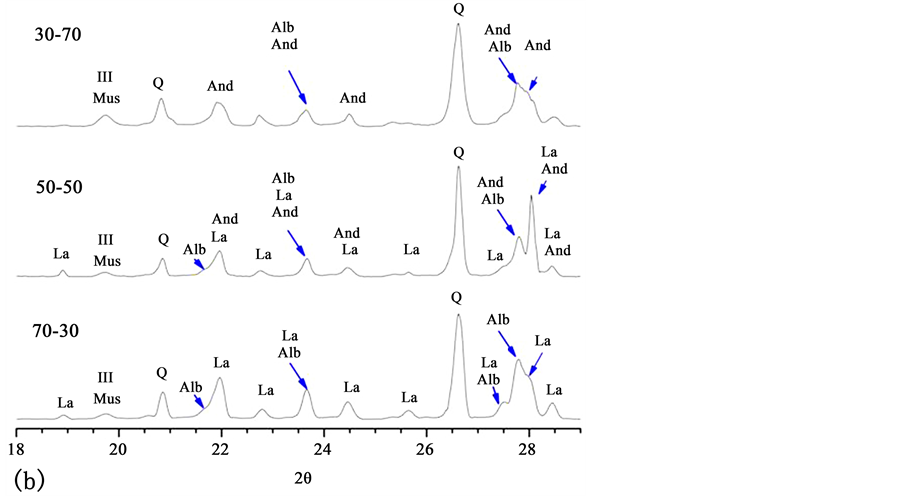 different proportions of LVG and IND materials sintered at 950˚C, in which it can be observed that the evolution kinetics of the three mixtures are complex and distinct. The diffractogram of the sample with a proportion of 30 - 70 suggests a predominance of andesine, albite, and quartz, whereas in the diffractogram of the sample with a proportion of 50 - 50, a predominance of labradorite, andesine, and quartz is observed. Finally, the diffractogram of