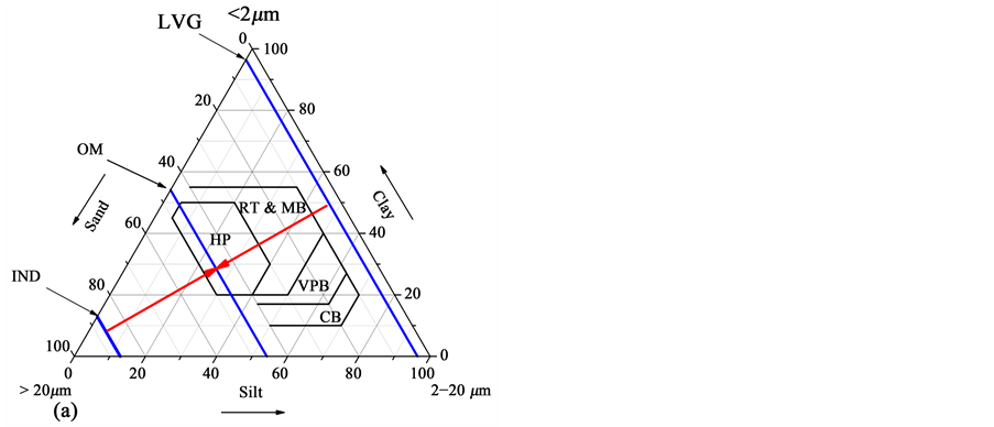 Figure 6. (a) Granulometry of the LVG, IND, and OM samples. The segments proceeding from the sand side to the silt side correspond to the sum of the slit and clay fractions. The segments with arrows point the OM granulometry. The spaces outlined inside the diagram represent the granulometric domains and their corresponding prognoses for use. Conventional brick (CB). Vertical perforated brick (VPB). Roofing tiles and masonry brick (RT & MB). Hallow products (HP). (b) Geotechnical properties of the LVG and OM materials. The two letters used to indicate each subgroup are derived as combinations of the following letters: clay (C), silt (S), organic (O), high plasticity (H), and low plasticity (L). (c) Prognoses for molding and/or extrusion in terms of Atterberg limits.