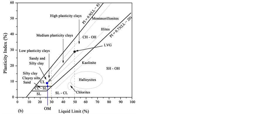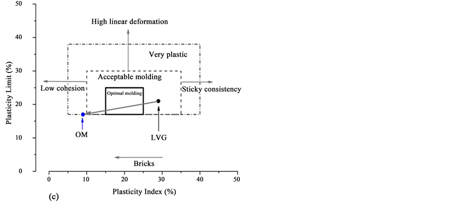 Figure 6(c) presents the workability diagram [42] . In this figure, the prognoses for the molding and/or extrusion of the LVG and OM materials are illustrated in terms of Atterberg limits. From this diagram, it is apparent that the LVG sample exhibited plastic properties that are considered acceptable for molding, whereas the plastic properties of the OM are close to the boundary between acceptable molding and very plastic behavior, with low cohesion. The addition of “sandy” material up to a proportion of 50% in the OM increases the fine sand content and results in a higher content of degreasing material and, consequently, lower plasticity.