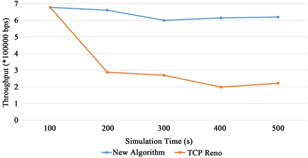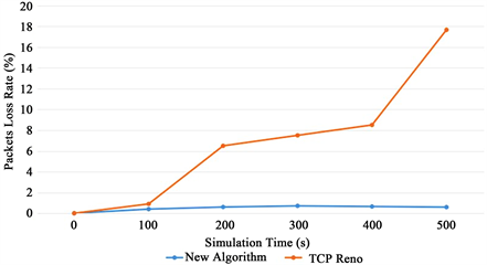 As shown in Figure 4, during secure attacks, the new algorithm reduces the possibility of link-disconnection caused routing reestablishment. In comparison, link interruptions frequently occur for the TCP Reno algorithm. As a result, packets loss rate gets more severe with the increasing simulation time.