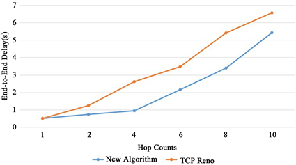 In Figure 6, when the number of hop counts is less, because the nodes are in the normal status, the end-to-end delay is relatively low for both algorithms. The congestion may occur during the increase of the number of hop counts. The new algorithm selects a new path to prevent the attack of malicious nodes, while the TCP Reno algorithm continues to send packets on the original path, which can only drop packets when congestion occurs. As a result, the end-to-end delay is larger for the TCP Reno algorithm.