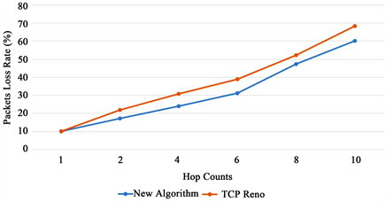 In Figure 7, with the increase of hop counts, the probability of packets loss in the network will increase for both algorithms. The TCP Reno algorithm causes serious packets loss due to its incapability to predict the congestion. In comparison, the new algorithm makes a prediction based on the average queue length and changes the path in advance, reducing the number of packets loss.